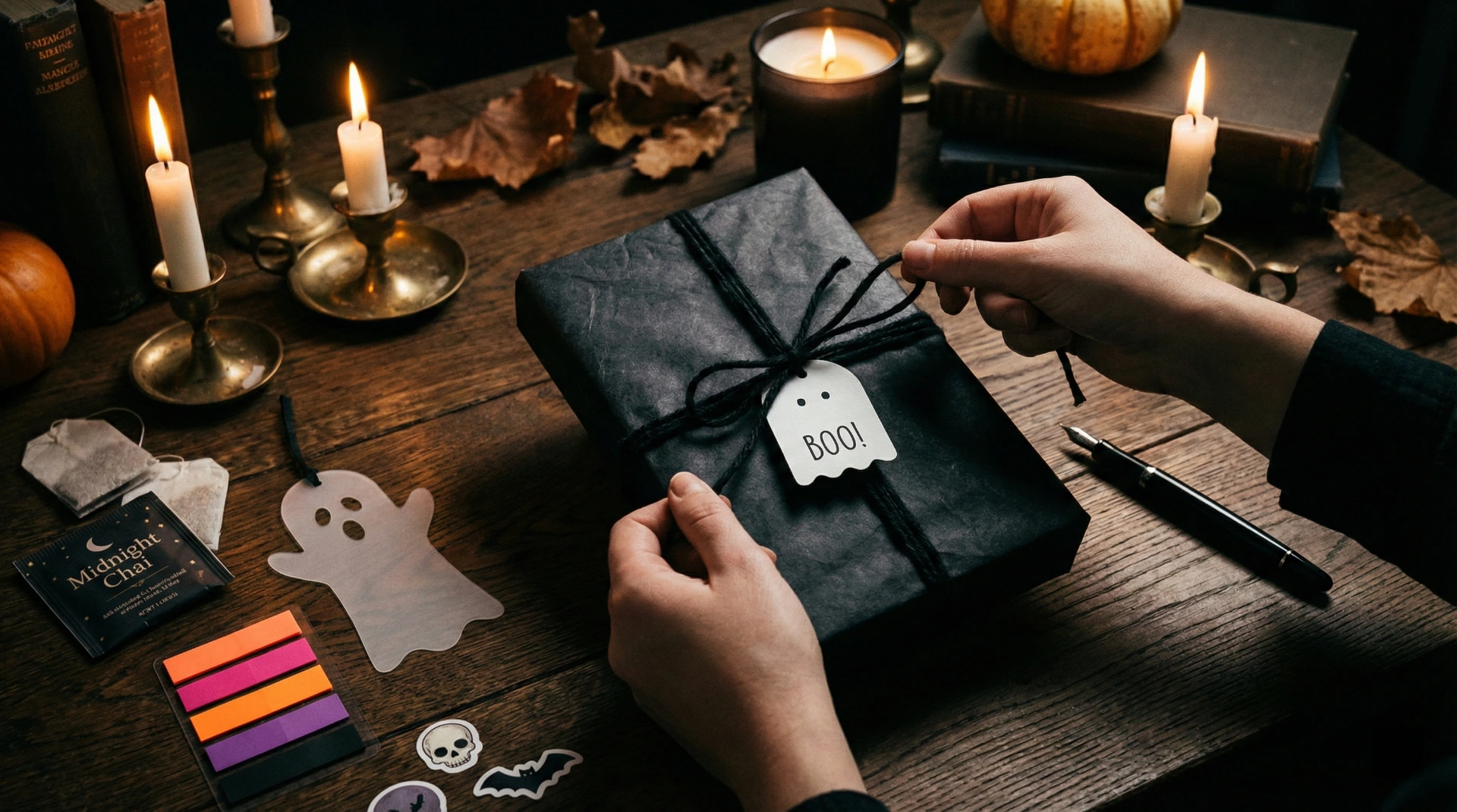 Hands unwrapping a twine-tied horror book beside a ghost bookmark, annotation tabs, stickers, and a tea bag on a moody wooden table