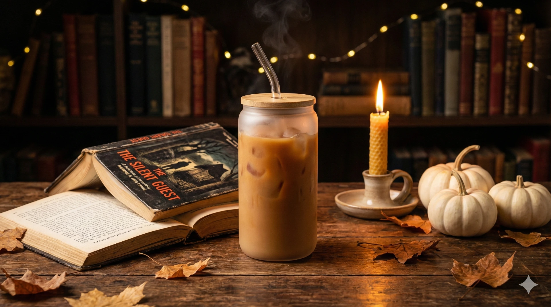 A spooky frosted glass tumbler with bamboo lid and straw beside an open horror novel, candlelight, and autumn decor